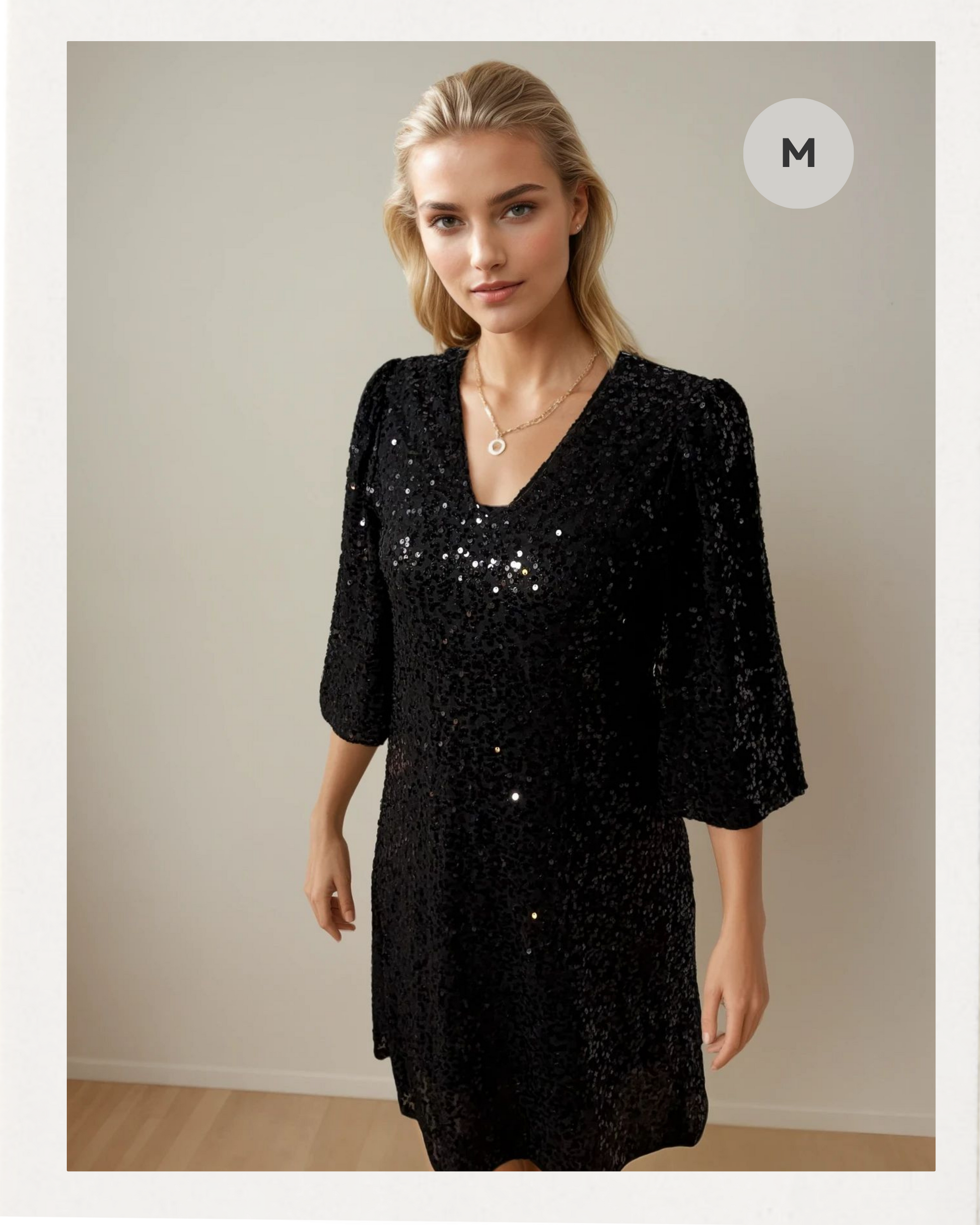 Das Kleid auf dem Foto ist ein elegantes, knielanges Paillettenkleid in klassischem Schwarz. Es besticht durch seinen angenehmen, leicht abfallenden Schnitt, der für eine schmeichelhafte Silhouette sorgt und viel Bewegungsfreiheit bietet. Trotz der üppigen Paillettenverzierung ist das Kleid überraschend leicht und angenehm zu tragen – perfekt für lange Abende voller Tanz und Feier.