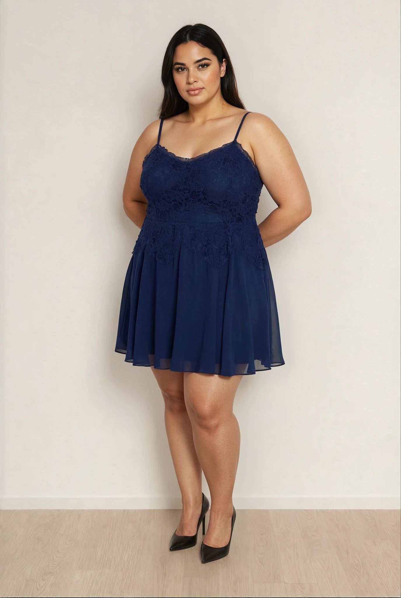 Dieses elegante SWING Kleid in dunkelblau (Navy) ist eine wunderschöne Wahl für festliche Anlässe wie Hochzeiten, Abendevents oder Cocktail-Partys. Das Modell kombiniert ein fein gearbeitetes Spitzen-Oberteil mit einem kurzen, luftig fallenden Chiffonrock und wirkt dadurch gleichzeitig feminin und edel.