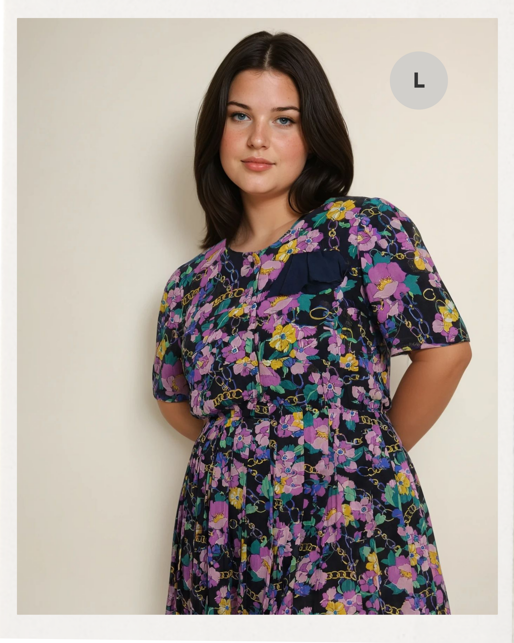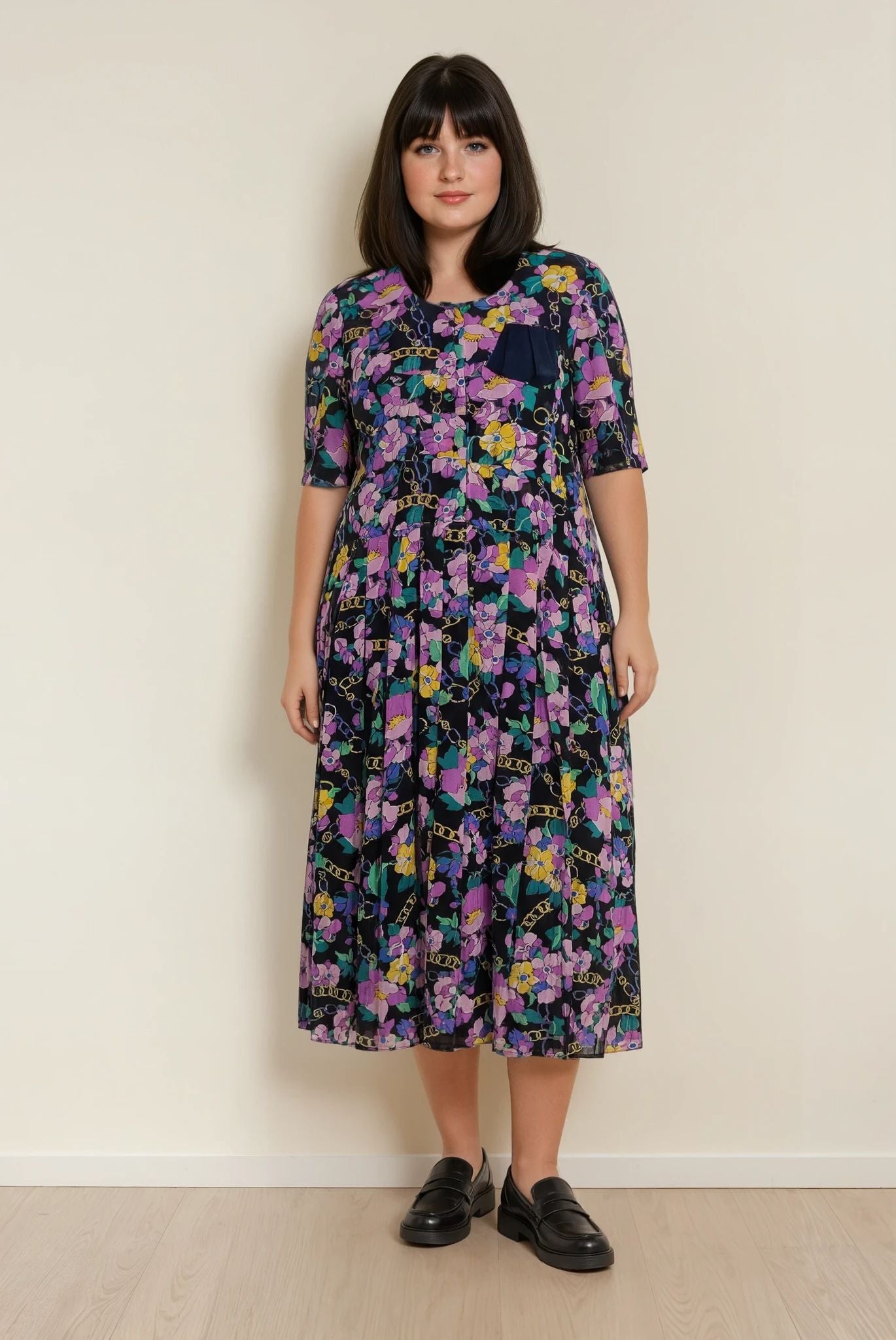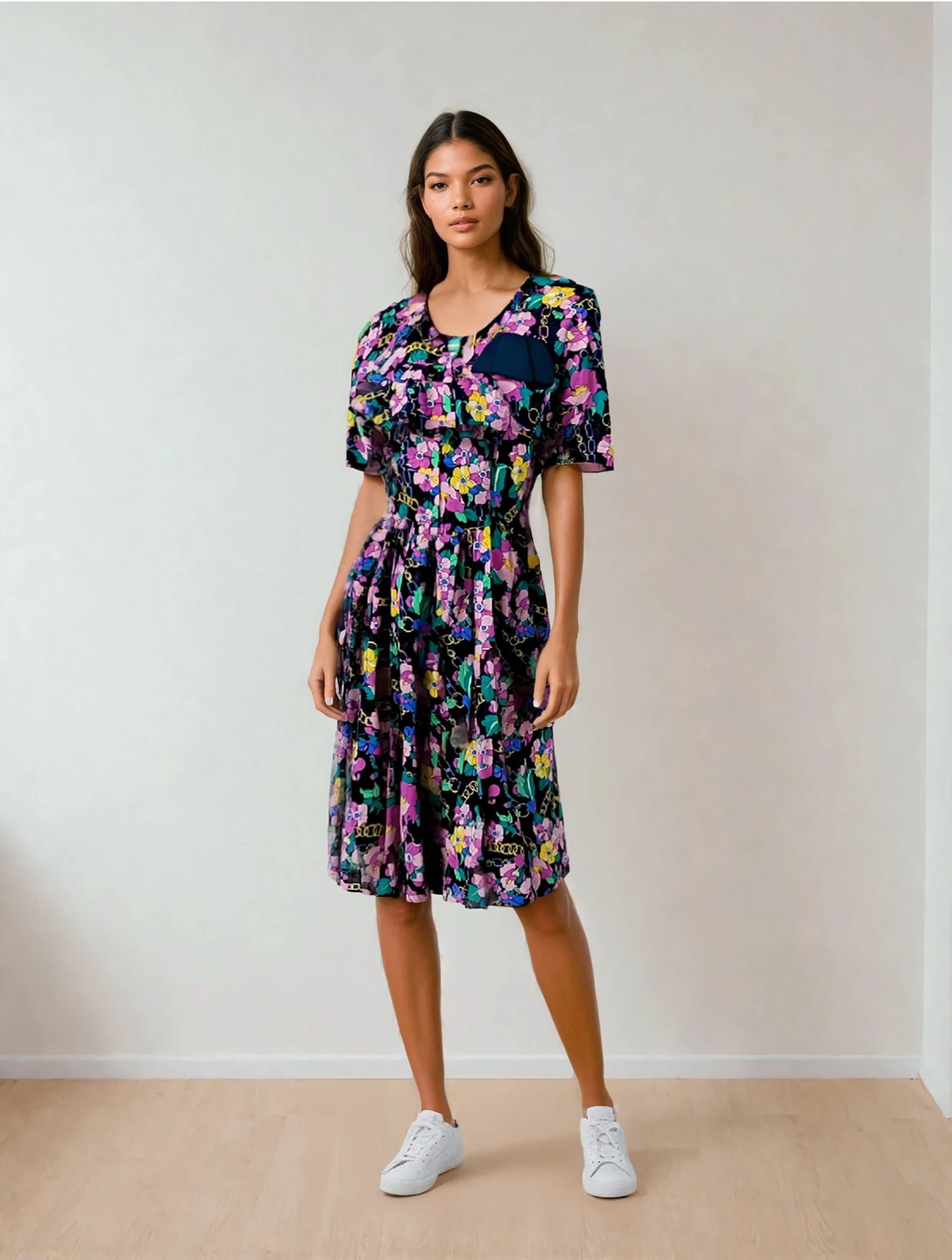 Dieses farbenfrohe Vintage-Kleid von Frankenwälder in Grösse 42/44 vereint klassischen Charme mit einem Hauch von Verspieltheit. Der lebendige, florale Print in kräftigen Farben wie Pink, Lila, Blau und Gelb sorgt für einen auffälligen und fröhlichen Look. Die Stretch-Taille bietet eine bequeme Passform und betont die Figur auf dezente Weise. Das Kleid hat halblange Ärmel und einen femininen Rundhalsausschnitt, der durch dekorative Details ergänzt wird. Ein besonderes Highlight ist das eingenähte Einstecktuch, das dem Design eine elegante und individuelle Note verleiht. Perfekt für Liebhaberinnen von Vintage-Mode, die Komfort und Stil kombinieren möchten.