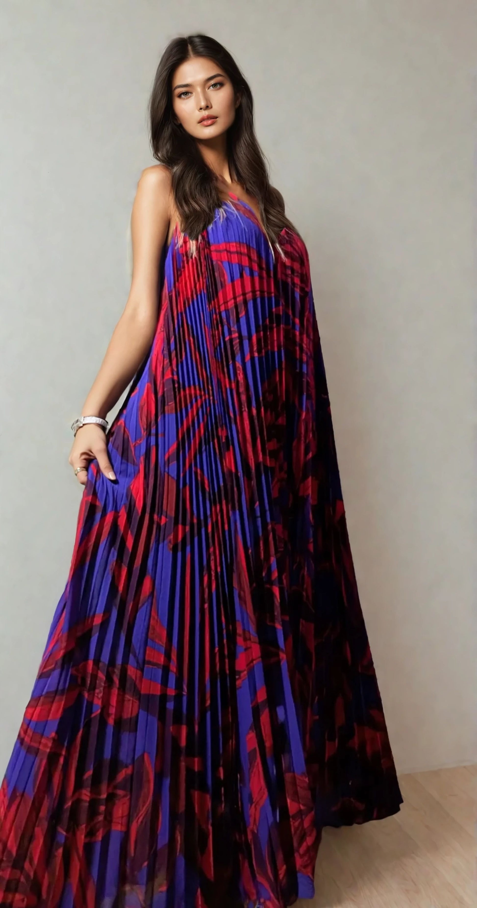 Elegantes, bodenlanges Plisseekleid in einem tiefen, dunklen Violett als Grundfarbe. Das auffällige Muster in Rottönen verleiht dem Kleid eine moderne und zugleich künstlerische Ausstrahlung. Der Stoff ist fliessend und sorgt für einen besonders schönen Fall, der jede Bewegung sanft begleitet.
